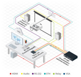 La solución se integra totalmente con el selector/escalador de presentación de seis entradas HDBase T y HDMI con salidas simultáneas VP-440; con los altavoces autoamplificados de pared de 5,25” de dos vías Tavor 5.0, así como con la solución modular de conexión múltiple para montaje en mesaTBus-3xl de este fabricante.