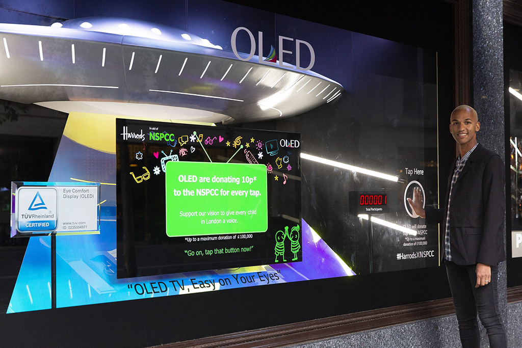 En una instalación de ventanas interactivas, el fabricante se ha asociado con los grandes almacenes londinenses para dar a conocer las últimas tecnologías de televisión OLED, para mostrar como estas soluciones ayudan al entorno del retail.