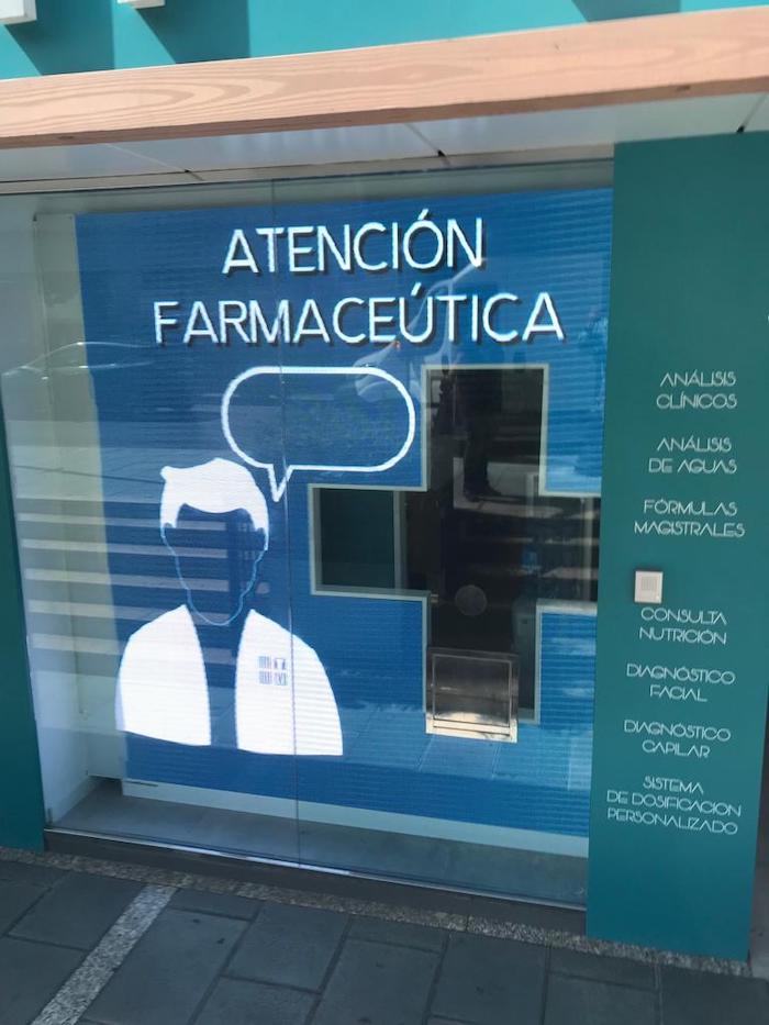 En el primer caso, Health&Pharma TV ha instalado una pantalla exterior, con pixel pitch de 3,9 mm y un tamaño de 2,8 metros de alto y 2,4 de ancho, con un diseño especial, ya que el farmacéutico tiene una ventanilla en medio de la cruz verde para atender a los clientes en su turno de guardias, y a su alrededor están los módulos Led para recrear la forma deseada y donde se anuncian los laboratorios.
