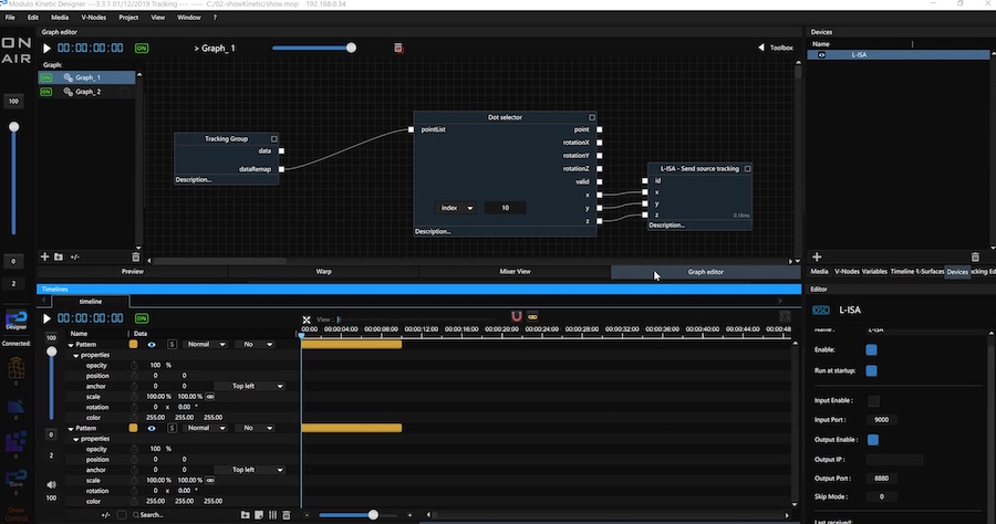 De esta manera, los operadores pueden controlar fácilmente la solución L-ISA directamente desde Módulo Kinetic, permitiendo el control del audio espacial desde el secuenciador de la línea de tiempo del servidor de medios, el motor 3D, el editor nodal o el controlador de espectáculos incorporado.