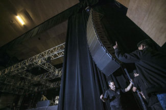 Uno de los retos es que este recinto no cuenta con la infraestructura necesaria para colgar un sistema de arreglo lineal desde el techo de su escenario, así que generalmente la producción utiliza un par de elevadores de torre, tipo genies, instalados a los costados del escenario.