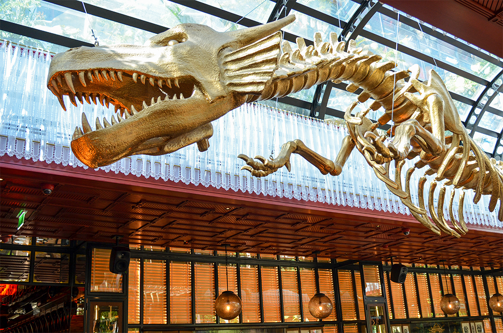 Para el área del restaurante, Garrett optó por un total de catorce 4040. El problema más grande en esta zona era la acústica, ya que la pared exterior es principalmente de cristal y hay un enorme atrio también de cristal sobre la cabeza, que aloja un más que imponente dragón.