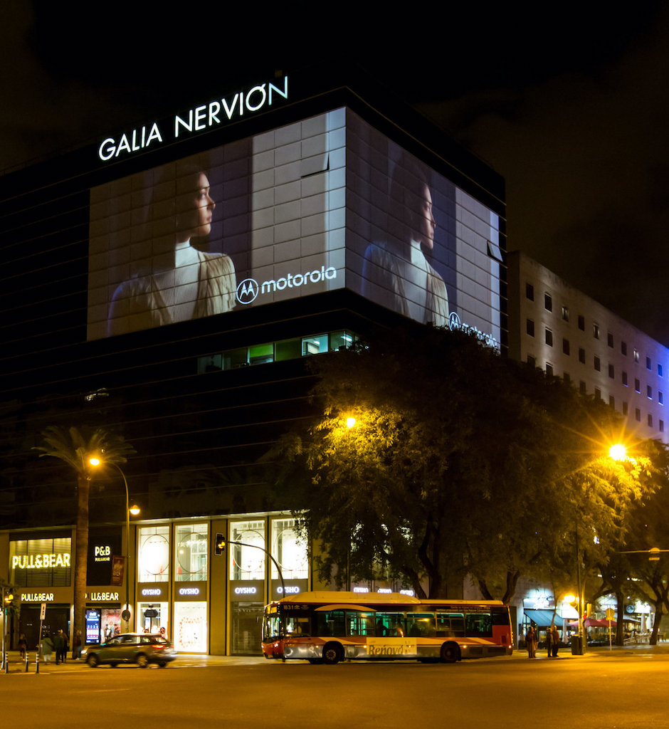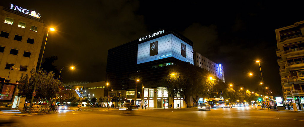 La compañía ya está utilizando dos proyectores Christie Crimson en una instalación DooH sobre la fachada del conocido edificio Galia Nervión, ubicado en el corazón comercial de Sevilla. La pantalla preside el cruce de dos avenidas muy importantes de la capital andaluza, que soportan un enorme tráfico de vehículos y peatones durante todo el año.