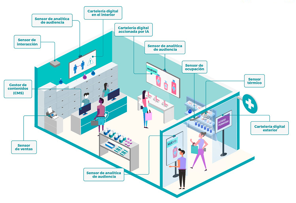 Esta solución tecnológica está integrada por cartelería digital, cámaras térmicas, sensores y el gestor de contenidos de la compañía. Su objetivo es mapear los espacios físicos para garantizar la distancia social y minimizar el contagio en cualquier espacio abierto al público.