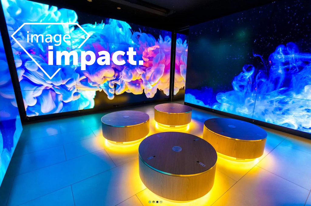 Las paredes frontales de este espacio (derecha e izquierda) se convierten así en una gran pantalla de 220” (de 4,8×2,7 metros, en tres superficies) para crear una experiencia inmersiva.