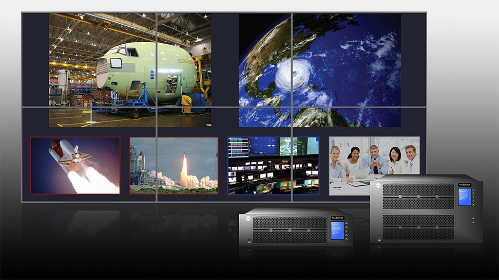 El procesador MediaWall V es compatible con todos los tipos de videowall. Hay una capacidad de superposición de imágenes disponible para videowall en proyectores, tiempos de salida personalizados que se adaptan a las resoluciones especiales de las paredes Led y la compensación de bisel optimiza la visualización con sistemas LCD.