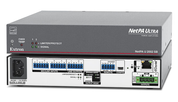 El NetPA U 2002 SB es el amplificador NetPA Ultra más potente y flexible de Extron. Cuenta con salidas para dos canales de 200 W para sistemas de baja impedancia o un canal de 400 W para baja o alta impedancia.