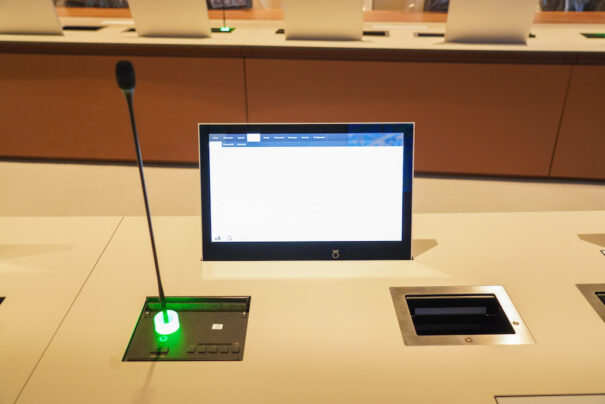 El resto de los asistentes dispone de monitores DB2, equipados también con cables retráctiles motorizados. Estos sistemas son únicos en su categoría y ocupan tan solo 2 cm. en la superficie de la mesa, con un diseño discreto y elegante que se adapta al del mobiliario del espacio.