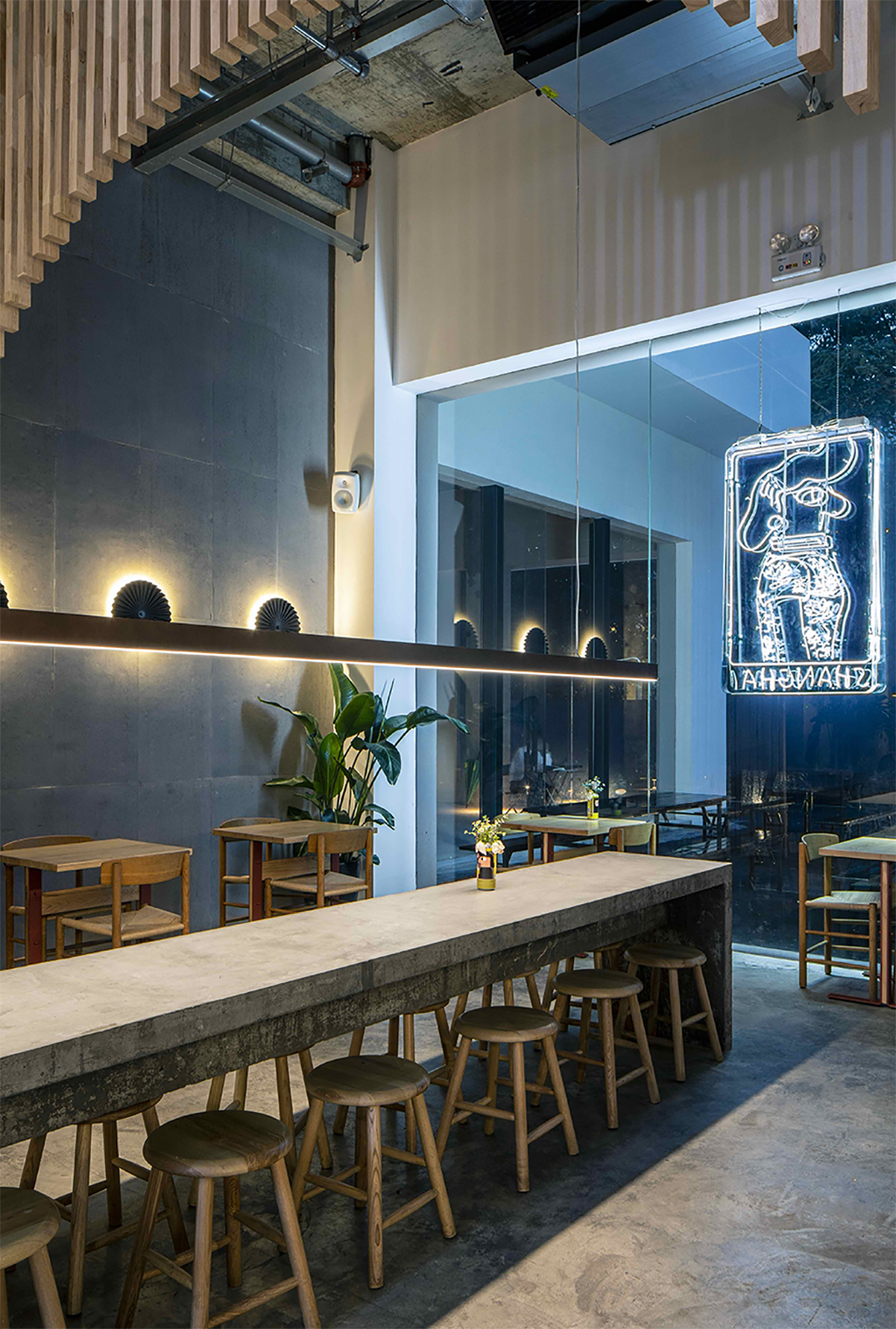 El diseño del bar gira en torno a materiales crudos y naturales, con muebles de madera y una iluminación suave que contrasta con los suelos de hormigón y el ladrillo visto. Los altavoces Genelec 4030 se adaptan a los criterios de calidad y estética de Mikkeller Shanghai.
