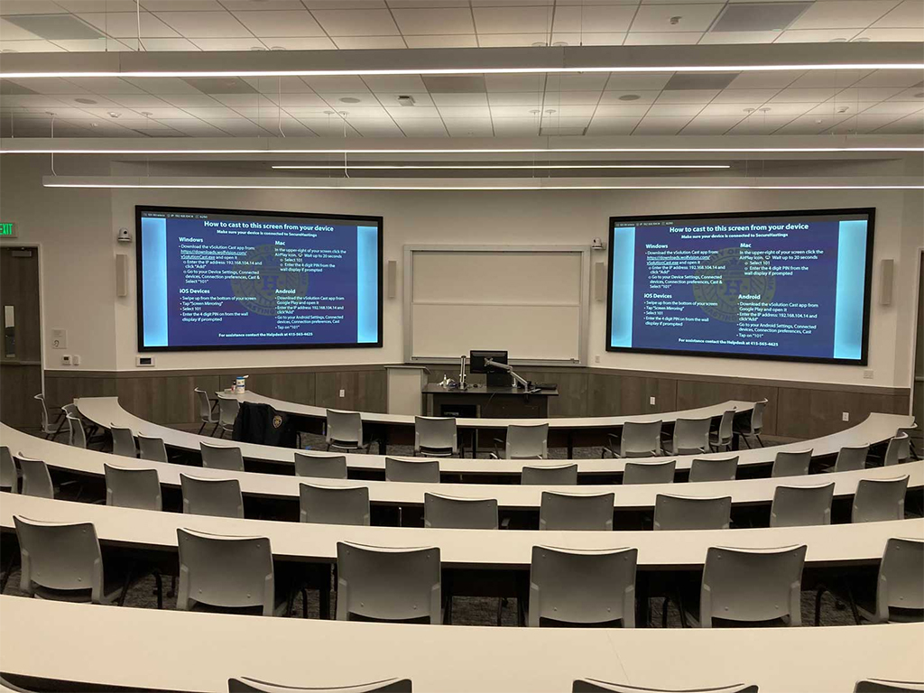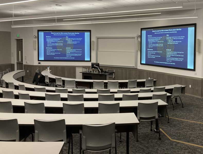 La Facultad de Derecho de UC Hastings necesitaba pantallas de proyección frontal de gran formato para sus salas de conferencias. Estas son utilizadas para realizar presentaciones y reuniones, además de dar clases.