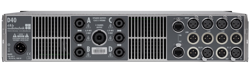 Desarrollado por d&b audiotechnik para aplicaciones móviles, el amplificador D40 cuenta con cuatro canales Clase D para ofrecer gran rendimiento del sistema con un bajo consumo energético.
