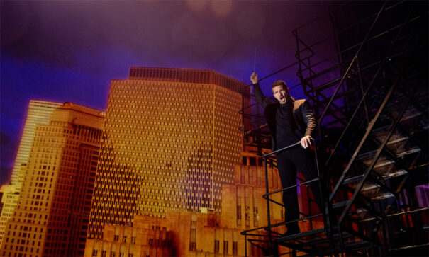 En los edificios, sobre el público, hay luces en las ventanas, personas asomadas…. todos miran hacia unas tablas donde el actor malagueño, junto a un elenco de 11 actrices y actores y 26 músicos, representará hasta el próximo mes de marzo el musical Company.