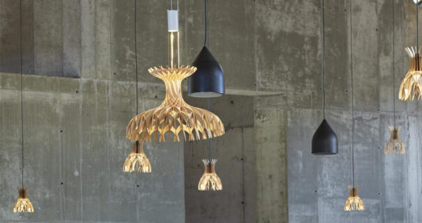 La particular forma cónica de los altavoces colgantes Biamp Desono combina con el diseño de las lámparas de araña de listones de madera, diseñadas por el estudio E.M.B.T. que, una vez encendidas, se reflejan en el suelo de piedra y cemento de color claro y dejan que la luz se filtre en todo el entorno para crear un armonioso efecto.