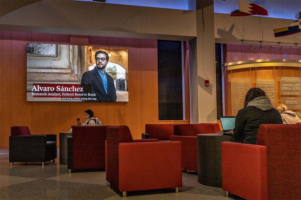«La intención era introducir algo en el atrio que tuviera un gran impacto en el espacio», comenta Debbie Campbell, vicedecana sénior de Fox School of Business. «En lugar de mostrar información estática, permiten involucrar a los estudiantes, profesores y visitantes, incluidos los futuros estudiantes y sus familias. La tecnología es multifuncional en lo que podemos hacer».