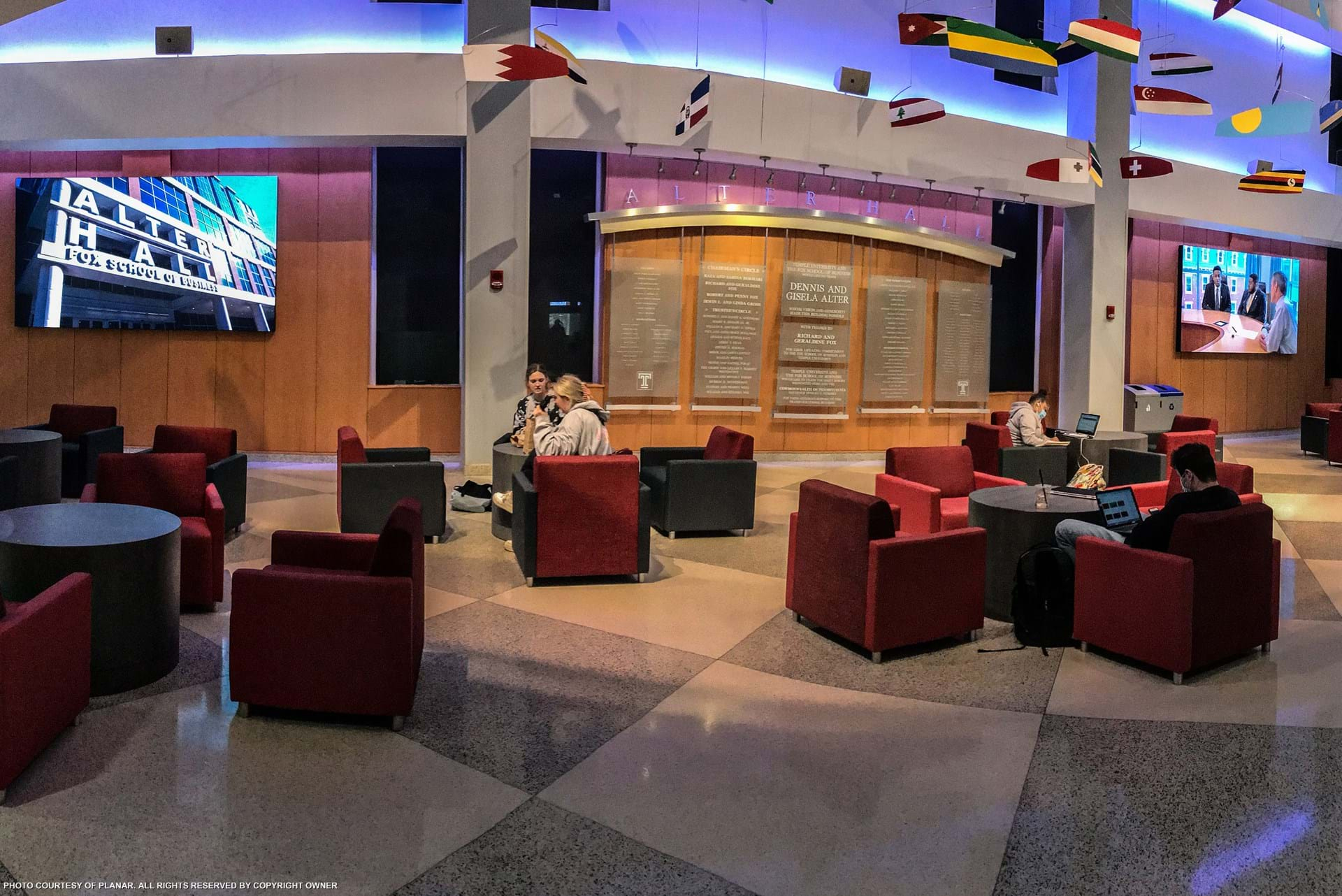 Integrado por Video Visions, los videowall están montados a ambos lados de un muro donante ubicado en un atrio abierto en la planta baja del Alter Hall, un centro de aprendizaje centrado en la tecnología de 66.141 metros cuadrados y uno de los instalaciones principales en el campus de Fox School.