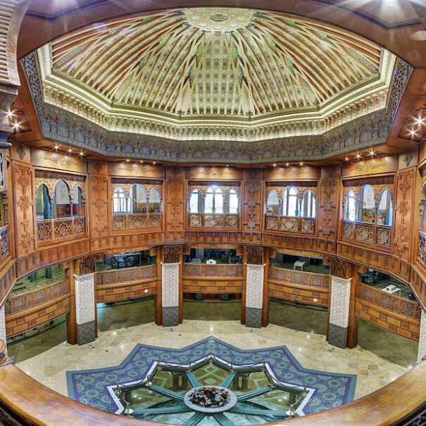 Fundacion Tres CulturasEl punto central de este edificio es su gran patio, en forma de estrella de ocho puntas, en torno al cual se articulan el resto de las dependencias, entre las que destacan la fuente de cristal y mármol que comunica con el patio de la planta sótano y su bella cúpula de artesonado policromado, que se desplaza sobre rieles dejando ver el cielo.