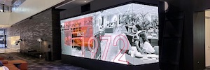 La instalación realizada en el vestíbulo muestra una pantalla Led con respuesta de audio y movimiento. Ha sido diseñada con una solución Bold de interior de SNA Displays.