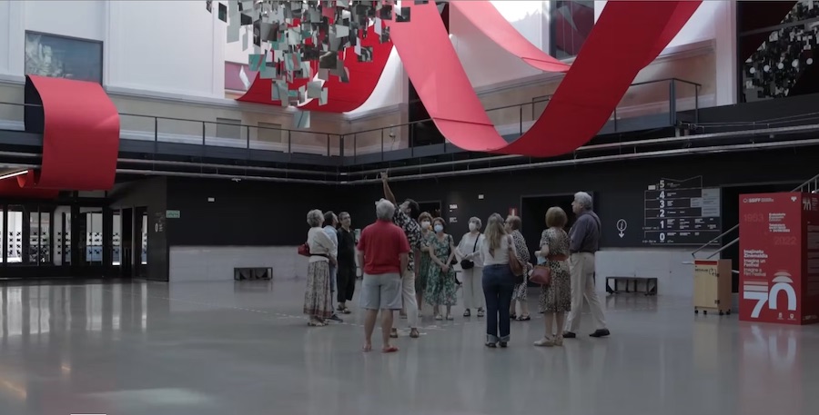 Por otra parte, dos Kubos suspendidos en el centro de la sala exhibían detalles del certamen, como las salas de cine, los diferentes jurados, los premios o el impulso a los nuevos talentos.