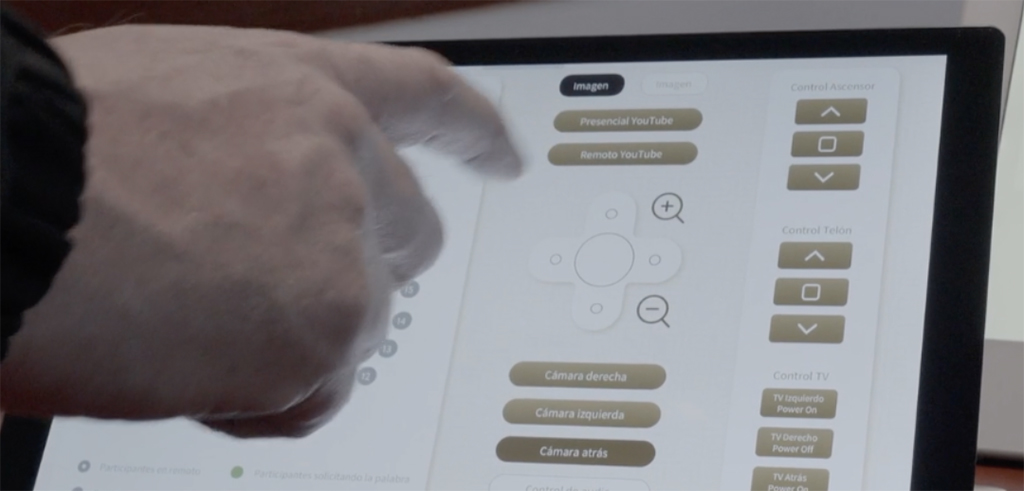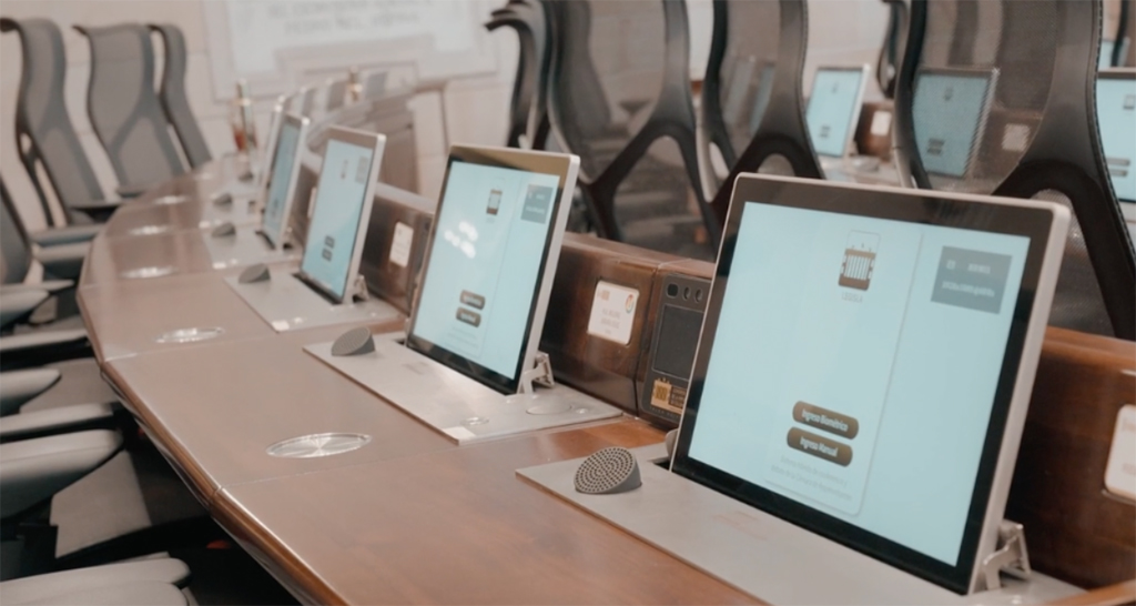 En la renovación realizada durante este año se ha dejado patente la apuesta por la tecnología híbrida. El reto consistía en disponer de monitores táctiles motorizados con micrófonos retráctiles, sistema de discusión integrado, identificación biométrica, votación y una solución para la visualización de documentos y de otros contenidos. La finalidad era crear un entorno híbrido, sin necesidad de papel, en el que se facilitara el debate y la votación y que pudiera ocultarse en el mobiliario.