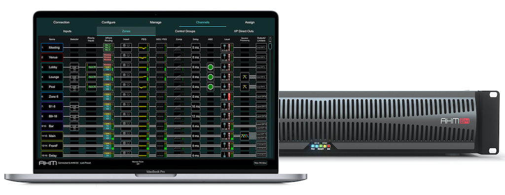 La gama de procesadores de audio matriciales AHM se también se ha mejorado con la nueva versión 1.4 del firmware y System Manager, que añade nuevas posibilidades de combinación de salas por medio de una interfaz visual para la creación y gestión de configuraciones de hasta dieciséis salas.
