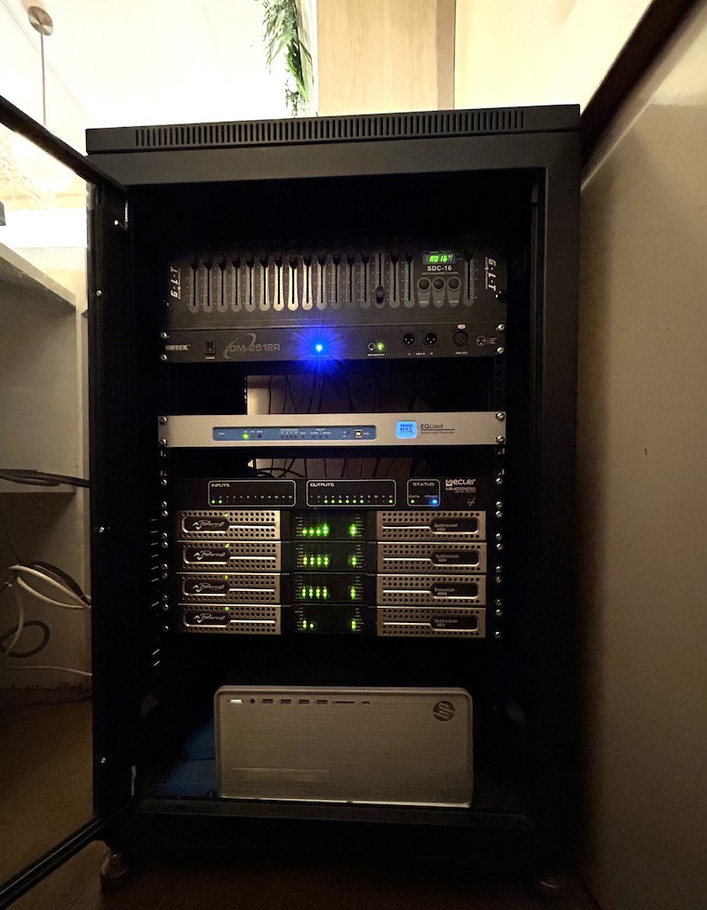 La potencia del sistema de sonido instalado en el Café de París proviene de los amplificadores Powersoft Quattrocanali, mientras que una matriz Ecler Mimo1212 emparejada con una pantalla táctil conforman la interfaz de zonificación. La música también puede transmitirse a través de Spotify desde cualquier PC.