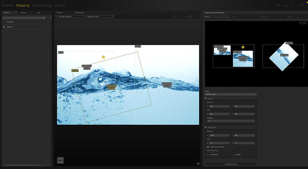 Otra de las funciones destacadas de este nueva actualización es Content Remapping, que permite definir múltiples áreas dentro de un marco de contenido y posicionarlas por separado en el espacio de composición. El uso de rectángulos, así como de polígonos libremente editables, permite colocar y girar, con precisión, las partes del contenido de píxel. Los retos de mapeado que se manejan mejor a nivel de contenido real se pueden dominar fácilmente con esta nueva función.