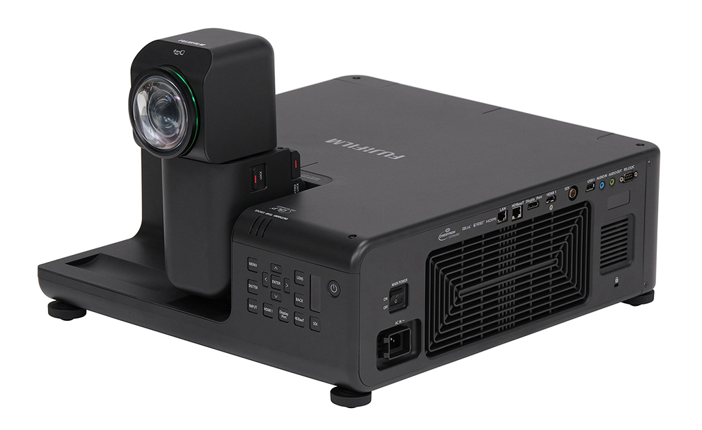 Fujifilm muestra estos días esta cámara durante su participación en Bitam 2023 en Madrid, junto con los proyectores Z8000 y Z6000, equipados con una lente giratoria biaxial plegada para proyectar imágenes en varias direcciones y desde una distancia cercana.