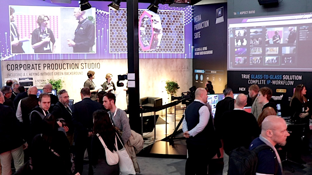 En la parte de broadcast y ProAV presentó un estudio de producción corporativo cien por cien Panasonic. “Desde la captación con las cámaras PTZ y de estudio, pasando por Kairos, hasta la visualización en los proyectores y pantallas de la compañía. Todo ello con flujo de trabajo cien por cien IP”.