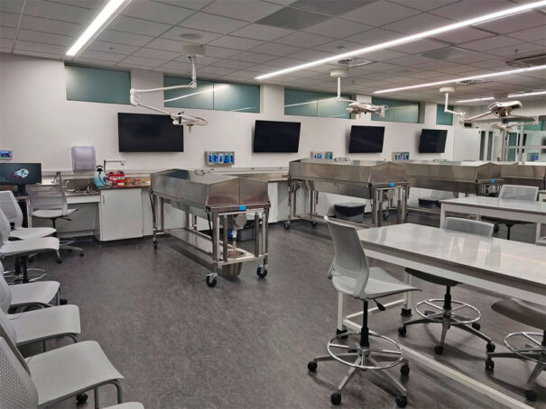 Dos laboratorios de anatomía combinables contienen 16 estaciones de disección. Por encima de cada estación, una cámara de vídeo apunta hacia abajo para capturar los detalles de anatomía durante las disecciones.