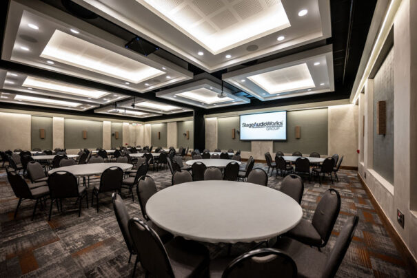 Stage Audio Works Mokuti EtoshaPreviamente, el centro de conferencias de Mokuti Etosha fue demolido para crear un nuevo espacio: un centro de experiencias independiente, con capacidad para hacer presentaciones por cable e inalámbricas, videoconferencia byom y control sencillo de la sala con un panel táctil para gestionar la iluminación y la alimentación de la pantalla.