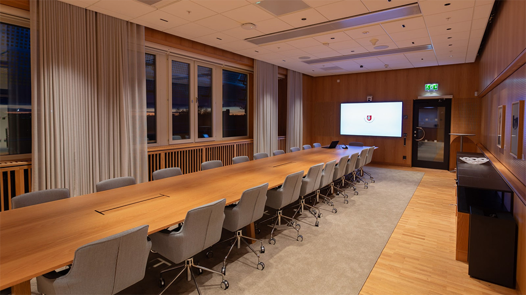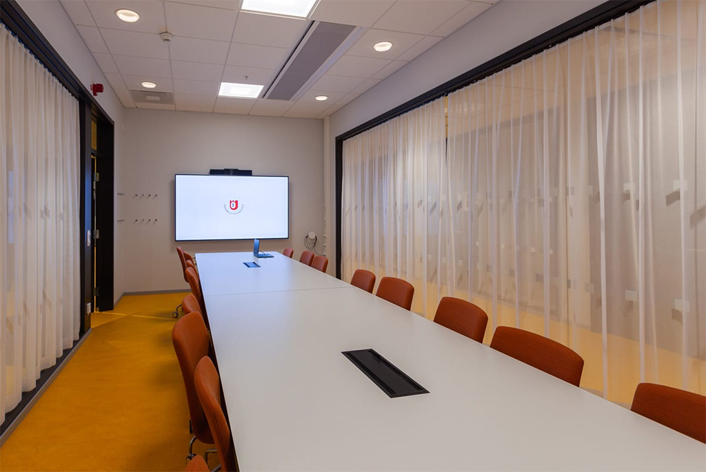 Cumplir ese objetivo significó que la pantalla también tenía que servir como absorbente, una tarea imposible para las soluciones disponibles en el mercado. «Creamos un absorbente de dos capas, similar al que tenemos en el techo, que era uno de gama baja con uno de alta gama en la parte superior», continúa Jørgensen, que instaló una pantalla microperforada DA-Lite para una máxima transparencia y colocó el absorbente personalizado detrás de la pantalla junto con micrófonos y altavoces de instalación ultracompactos UP-4slim.
