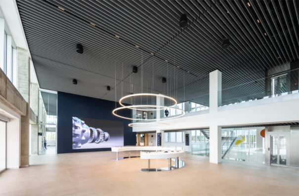 Hubtech y Earpro&EES han dado respuesta a las características estructurales del vestíbulo y el auditorio del nuevo edificio Fersa Lab proporcionando el equipamiento AV preciso para esta instalación de alta complejidad.