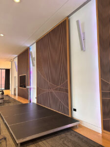 Complementando los amplificadores Powersoft y el sistema de altavoces Bose se encuentran una pantalla táctil Q-SYS TSC-70-G3, un procesador Q-SYS Core 110f v2 y un Blackmagic Videohub, que incluye una matriz Smart Videohub 12×12 SDI, para contenido de vídeo.