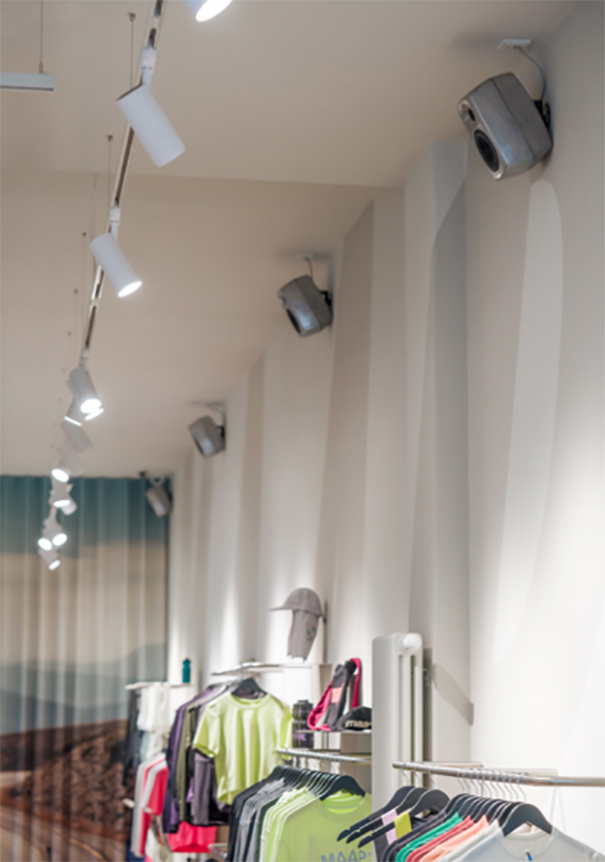 El MAAP Berlin LaB cuenta con un diseño abierto lleno de prendas de ciclismo de alto rendimiento, que absorben el sonido de forma natural. Esto permitió a B.I.N.S.S renunciar a tratamientos acústicos adicionales. En su lugar, ajustaron los altavoces al espacio, logrando niveles de sonido equilibrados y eliminando zonas muertas o puntos calientes.