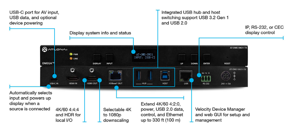 Atlona ha anunciado la disponibilidad del AT-OME-SW21-TX. Un conmutador 2×1 y transmisor HDBaseT con entradas USB-C y HDMI, salidas HDMI y HDBaseT duplicadas y un concentrador USB 3.2 Gen 1.