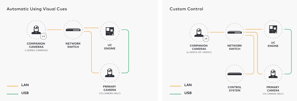 En ambos casos, la configuración se simplifica gracias a una conexión USB desde la cámara principal (modelo i12) a la plataforma de videoconferencia. Desde allí, la conmutación inteligente admite hasta cuatro cámaras complementarias, además de la principal.