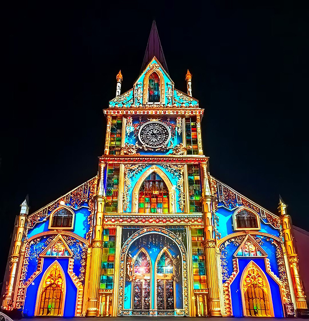 El modelo Christie DWU23-HS, con sus 23.650 lúmenes de brillo y rendimiento cromático mejorado, fue especialmente eficaz en las proyecciones arquitectónicas a gran escala, transformando superficies como la fachada de la iglesia en lienzos luminosos en movimiento.