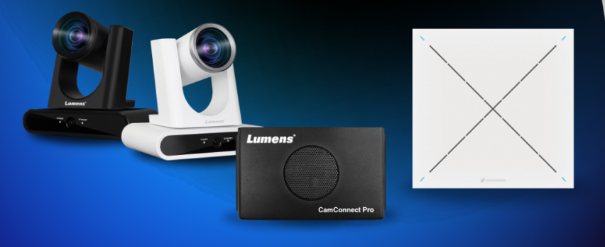 Esta colaboración demuestra la integración del sistema de cámaras con seguimiento de voz CamConnect Pro de Lumens con los micrófonos de techo TeamConnect de Sennheiser.