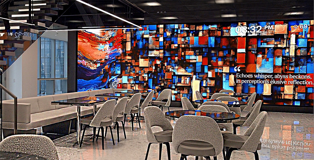En el centro de recepción de clientes de AllianceBernstein se ha creado una experiencia denominada Dreamwall que funciona como una ‘obra de arte viviente’. Un videowall diseñado con una solución Led Planar DirectLight Pro de 4,5x 2,4 metros y una distancia entre píxeles de 1,2 mm.