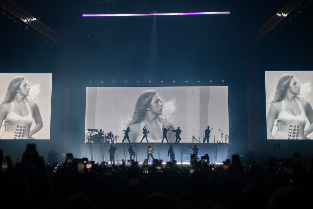 Desde el principio estaba claro que la escenificación sería cualquier cosa menos convencional. El diseño, realizado por AJ Sutherland, director de producción de Tate McRae, incluye un escenario principal, con una pasarela central extendida hacia el público, que acaba en otro en forma de T, además de un escenario B con un ascensor de tijera en el otro extremo del pabellón, detrás de la posición de mezcla de FoH.