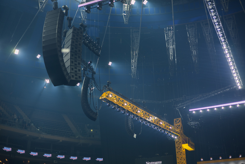 El sistema principal de PA utiliza ocho puntos de rigging con la serie SL de d&b. Los arreglos de GSL a cada lado de la estructura están respaldados por subwoofer SL colgados, que se complementan con clústeres laterales de KSL y puntos de rigging para XSL a 270˚.