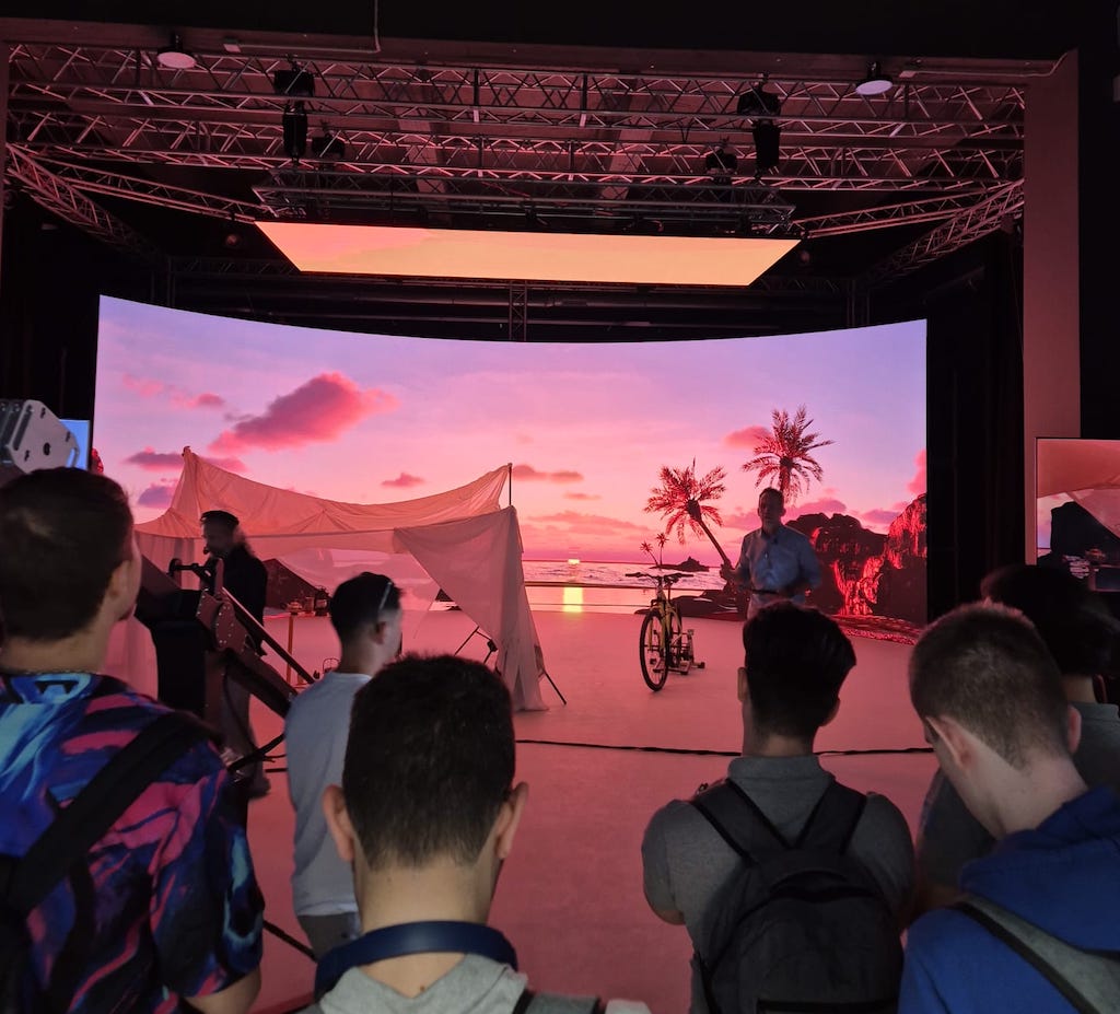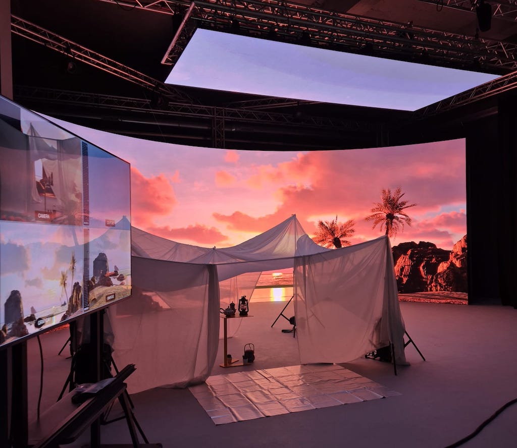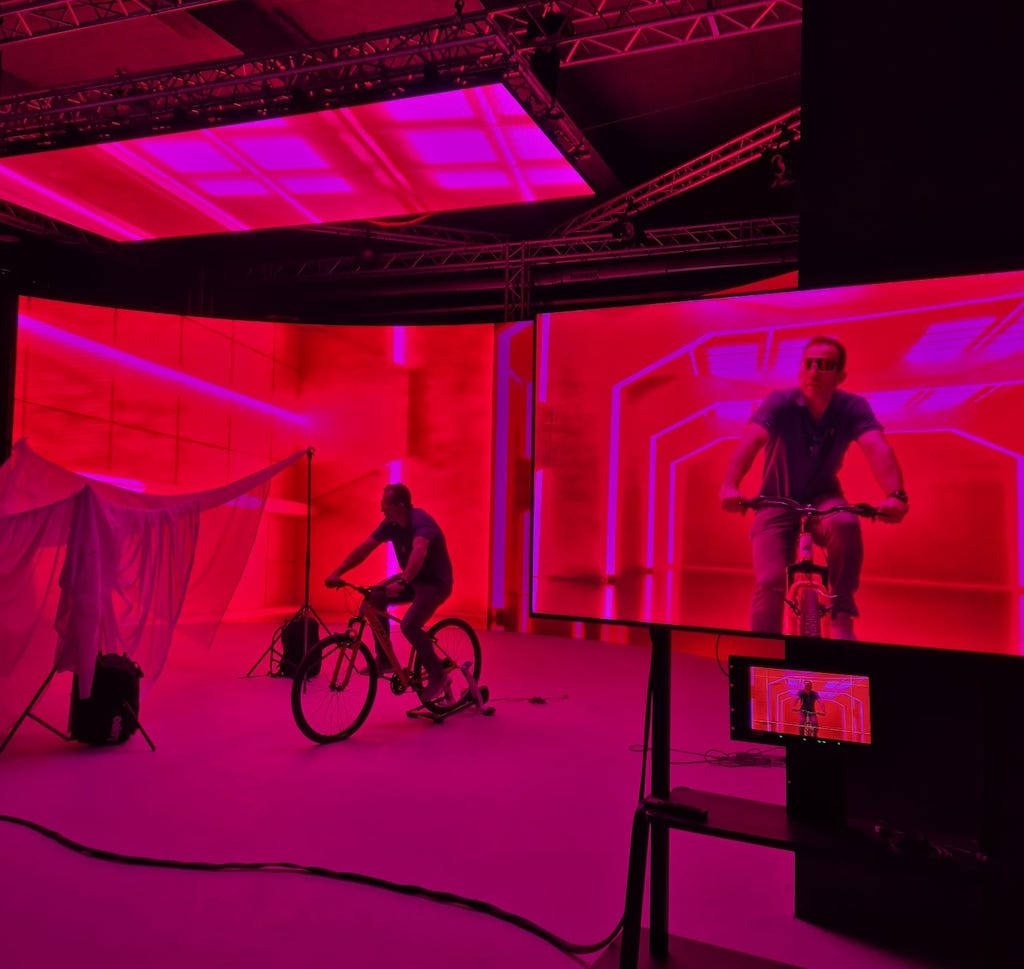 La instalación Led está totalmente integrada con una cámara profesional RED, un sistema de tracking de cámara Mo-Sys para una sincronización precisa en tiempo real, y uno de captura de movimiento Movella que permite animaciones dinámicas de personajes y actuaciones en XR.