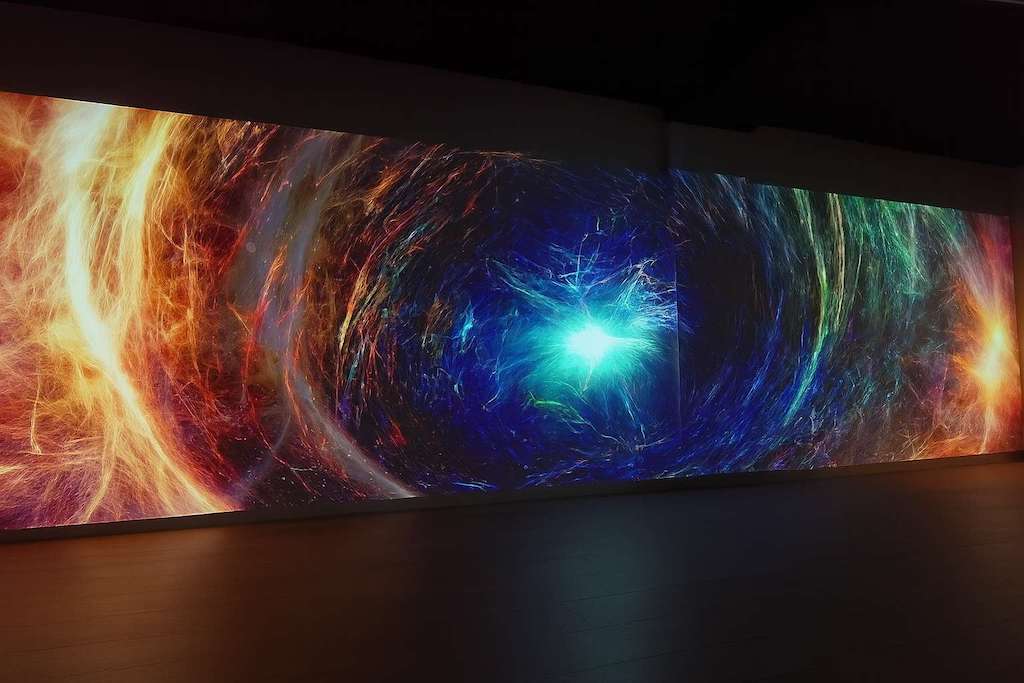 La superficie de proyección, pintada en un tono gris neutro para resaltar la viveza de los colores, muestra contenidos en bucle adaptados a cada sesión, desde paisajes naturales relajantes hasta viajes cósmicos animados.