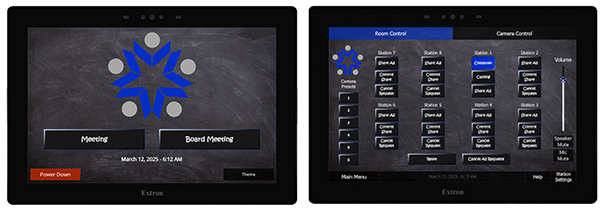 La estación principal incluye una pantalla táctil TouchLink Pro de 10 pulgadas que muestra una interfaz de operador con funciones de control administrativas. Desde esta pantalla táctil, el operador de la estación principal puede encender y apagar el sistema AV de la sala, enrutar contenido AV entre las ocho estaciones de trabajo, garantizar los privilegios de control a otras estaciones y muchas otras funciones de control AV.