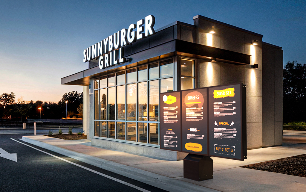 Idónea para menús de autoservicio en restaurantes de comida rápida (QSR) y señalización de orientación, es compatible con pantallas de exterior de Samsung y LG de 55 pulgadas y se adapta a futuras ampliaciones.