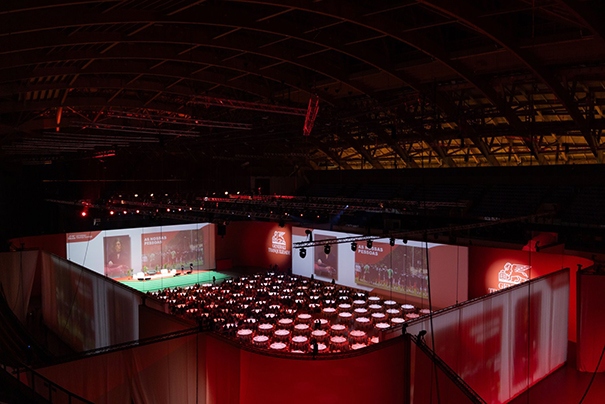 Uno de los momentos más impactantes del evento fue la proyección de vídeo sincronizada sobre las 192 mesas redondas, cada una de 1,8 metros de diámetro. Para garantizar uniformidad y nitidez en la proyección, las superficies fueron revestidas internamente con vinilo. El resultado visual, de gran complejidad, se logró gracias a 14 proyectores Christie 20K y 16 16K, coordinados para crear un efecto homogéneo en toda la zona del banquete.