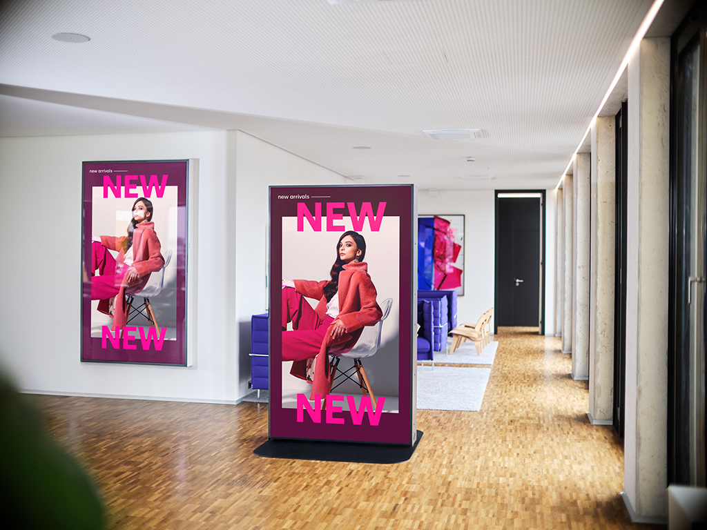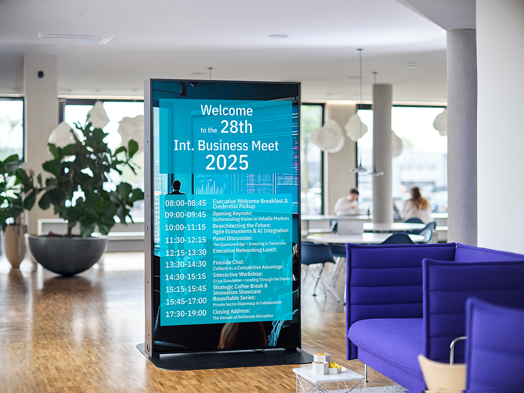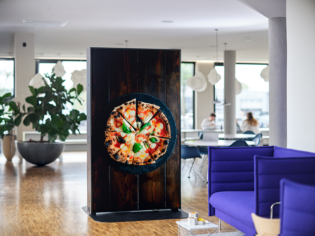 Las dos pantallas están montadas espalda con espalda en formato vertical utilizando un soporte para pantallas Celexon de alta calidad. El quiosco tiene una altura de 220 centímetros y cada pantalla ofrece hasta 1500 nits de luminancia para una óptima visibilidad, incluso en entornos luminosos.