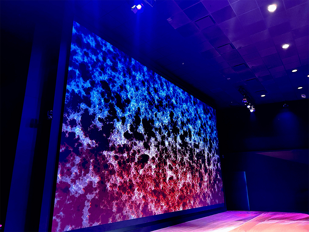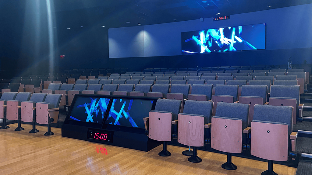 «Antes de la modernización, el auditorio contaba con una configuración deficiente», explica Nix. «El sistema visual principal era una pantalla de retroproyección de una década de antigüedad, apoyada por dos pantallas LCD de 85 pulgadas. Los presentadores utilizaban pequeños monitores de suelo para sus notas, mientras que dos proyectores en la pared trasera servían como monitores de confianza. Todo el sistema funcionaba con un conmutador de matriz HDMI estándar».
