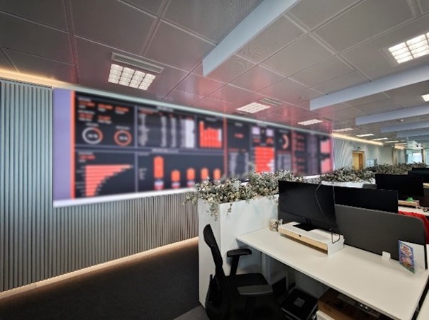 La zona de recepción de las nuevas oficinas cuenta con una pantalla Led de gran formato, de 4,8 metros de ancho y 1,35 de alto, diseñada y fabricada por MaxHub, destinada a recibir a empleados, visitantes y clientes y en la que se refuerza tanto la identidad de marca como la comunicación de los valores y visión de esta compañía.
