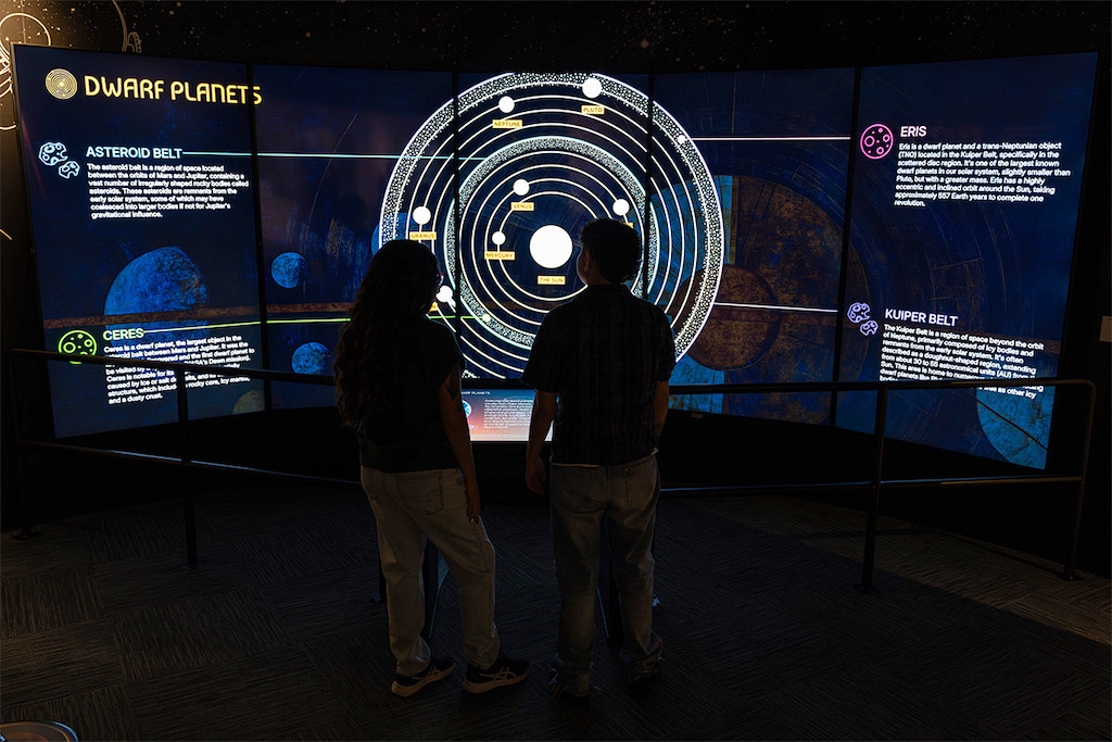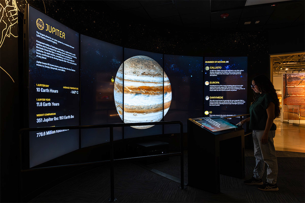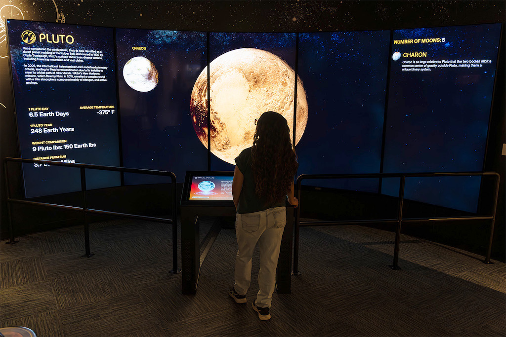 El sistema audiovisual de Ideum para esta exposición se ha diseñado de manera que los visitantes pueden interactuar dinámicamente con el contenido planetario mientras escuchan a Clyde Tombaugh narrar su viaje en un entorno inmersivo.